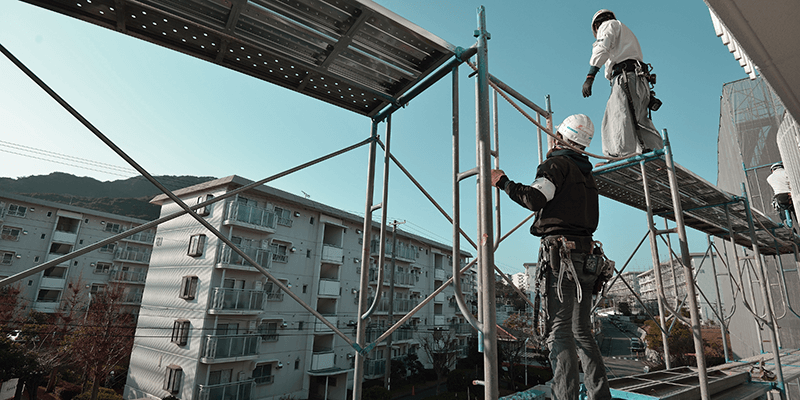 ビルや橋梁、倉庫や発電所など、様々な構造物の建設に必要となる、足場・安全設備を設置します。外壁の塗装や補修のための工事にも必要となります。当然足場の解体も含まれます。